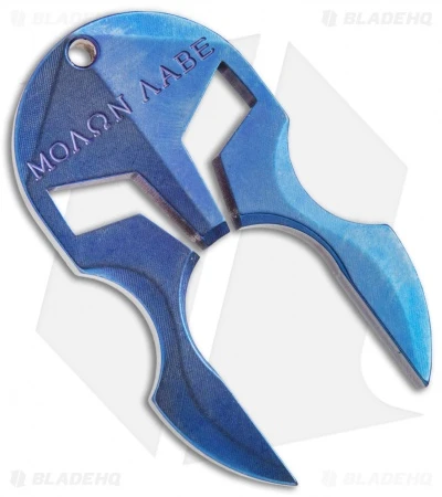 The AdV Tactical knuck boasts an enviable look resembling a gladiator helmet. This solid titanium knuck is custom anodized and has a hole for attachment to a keychain or lanyard. Due to the unique anodized finish, the actual Tac Tool is pictured above. This model has a blue and purple finish.