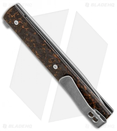 This Fruit Knife features a stonewashed drop point blade with a flipper opener. The titanium liner lock handle is outfitted with unique copper shred CF scales. The pocket clip is titanium as well with a bead blasted stonewash finish. This knife is beautiful, lightweight, and sleek.