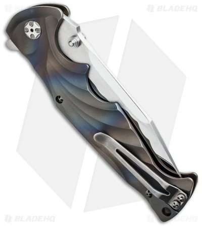 This custom Tighe Breaker folder features a heat colored titanium handle with fluted faces and a stainless steel pocket clip. The Tighe Breaker has an appealing compound ground blade with a flipper and thumb studs for one-hand opening. This fine knife is yet another great example of Brian Tighe’s fine work.