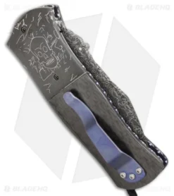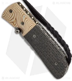 This Drop Point folding knife features a 416/52100 San Mai Damascus steel blade with thumb stud opener on front and stamped “Burr Oak Nevling” on back. The handle features bronze bolsters and lightning strike carbon fiber scales over titanium liners. The steel back spacer is filed, along with the liners and blade spine. This knife comes with a signed certificate of authenticity, dated 8/14/13.