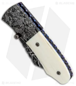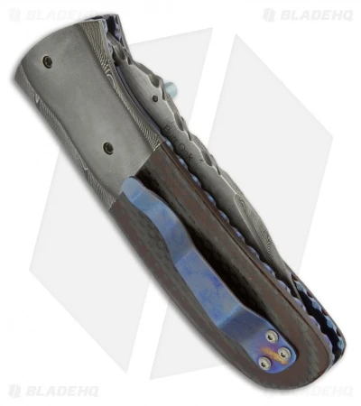 This First Responder folding knife features a 416/Twist Damascus San Mai steel clip point blade and bolsters. The blade opens with the thumb stud opener on front and the back side is stamped “Burr Oak Nevling”. The handle features layered carbon fiber and red G10 scales over titanium liners, with lock tab. The pocket clip is also titanium with a matching blue anodized finish. The steel back spacer is filed, along with the liners and blade spine. This knife comes with a signed certificate of authenticity, dated 5/9/13.