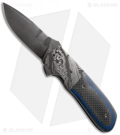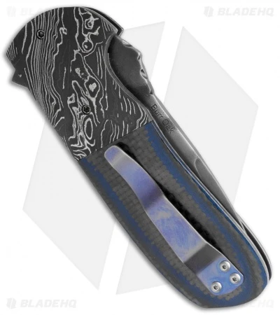 Flipper #1 from Burr Oak Knives has arrived. This folding knife features W2 steel blade with a flipper opener, swedge grind and filed spine. The titanium liner lock handle is outfitted with ‘twisted parquet’ Damascus bolsters and blue G-10/carbon fiber scales. Its anodized titanium pocket clip matches the finish of the liners. A filed backspacer tops the handle to round out this superb knife. This knife comes with a signed certificate of authenticity, dated 10/9/14.