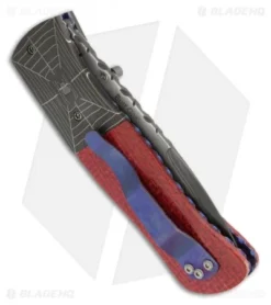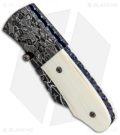 This Mini Combat Utility knife features a mosaic damascus steel wharncliffe style blade with a thumb stud opener. The handle sports matching damascus scales and fossil walrus ivory scales over blue anodized titanium liners. Filework on the liners and a damascus backspacer finish off this impressively intricate design. This knife comes with a signed certificate of authenticity, dated 6/1/18.