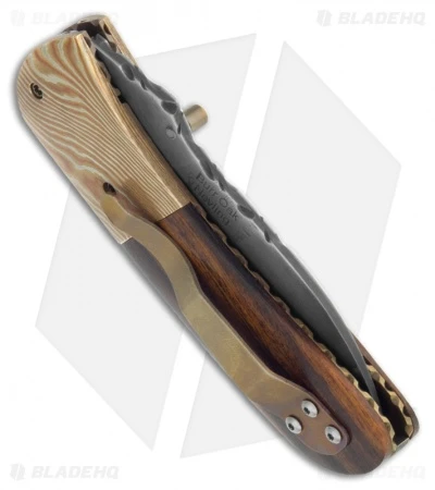 This Snub Nose folding knife is an impressive mix of materials with a high level of refinement that will find a welcome place in any fine collection. The drop point style blade is 416/W2 San Mai Damascus steel with thumb stud opener on front and stamped “Burr Oak Nevling” on back. The handle features Mokume bolsters and beautiful Ironwood scales over titanium liners, with lock tab. The pocket clip is also titanium with a matching bronze finish. The steel back spacer is filed, along with the liners and blade spine. This knife comes with a signed certificate of authenticity, dated 3/5/13.