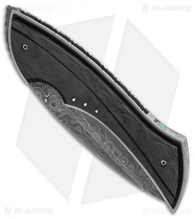 This B WARE Flipper from Corrie Schoeman features marble carbon fiber over black G-10 and a titanium liner lock frame. The modified spear point style blade is made from Alabama Forge damascus steel. This knife has been embellished with filework on the liners and back spacer with a paua shell insert. The action on this knife is super smooth with a caged ball-bearing pivot and an excellent build.