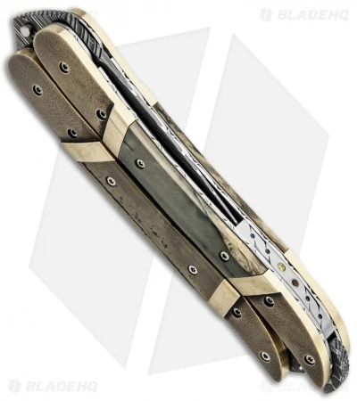 This Balisong knife from Corrie Schoeman is a hand-made piece. The handle features mammoth ivory inlays and bronze bolsters. The liners and titanium backstrap are filed. The back spacer features Citrine and Ruby inserts. Damascus latch. The blade is Damascus steel with a file worked spine. This is a spectacular knife that will make a great collector’s piece. Pictured above is the actual knife for sale. This knife was made in March 2013.