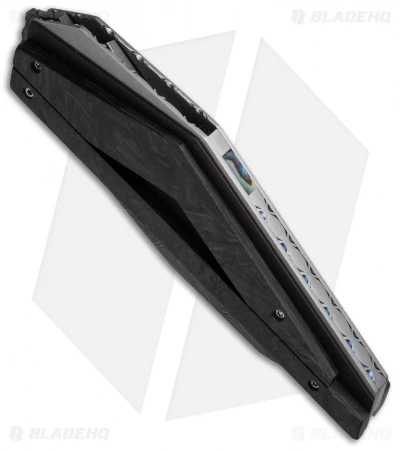 The D-Fuse flipper from Corrie Schoeman offers ultra clean lines and a modern aesthetic. This model has a damascus steel blade and marble carbon fiber scales. The ball-bearing pivot provides smooth, effortless action. It has a titanium liner lock handle with black G-10 onlays. This knife has been embellished with filework on the blade spine, liners and back spacer. A pearl inlay on the spine of the blade adds an elegant finishing touch to the piece.