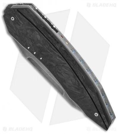 The D-Fuse flipper from Corrie Schoeman offers ultra clean lines and a modern aesthetic. This model has a 1095 Hamon steel blade and marble carbon fiber scales. The ball-bearing pivot provides smooth, effortless action. It has a titanium liner lock handle and backspacer with ruby and citrine inserts. This knife has been embellished with filework on the blade spine, liners and back spacer.