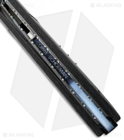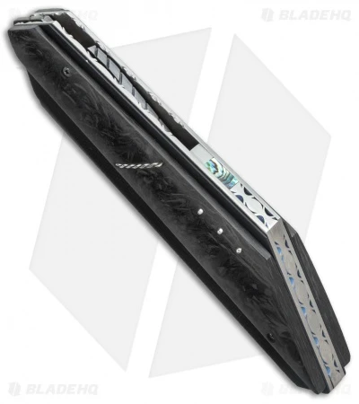 The T-Mate Flipper is an intriguing design from Corrie Schoeman. This model has a marbled carbon fiber handle over a thin black G-10 scale. The liners and titanium backstrap are filed and feature with Ruby & Citrine inserts on the spacer. The angular modified tanto style blade is Texas Knives Damascus steel. The action on this knife is super smooth with a ball-bearing pivot and it has an excellent build.