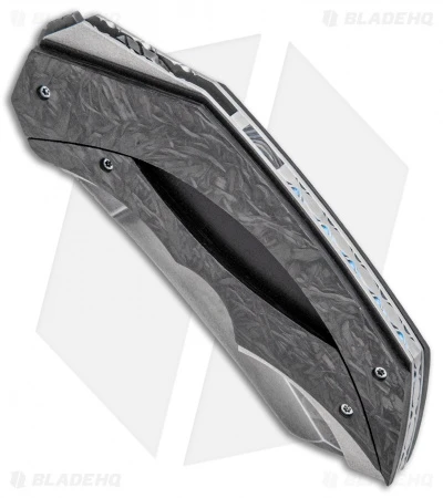 The X-Ecute flipper from Corrie Schoeman is an impressive showpiece, characterized by precision craftsmanship. This model has an Alabama Damascus steel blade and marble carbon fiber scales with G-10 underlays. The ball-bearing pivot provides smooth, effortless action. It has a titanium liner lock handle with black G-10 onlays. This knife has been embellished with filework on the blade spine, liners and back spacer. An abalone inlay on the spine of the blade adds an elegant finishing touch to the piece.