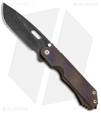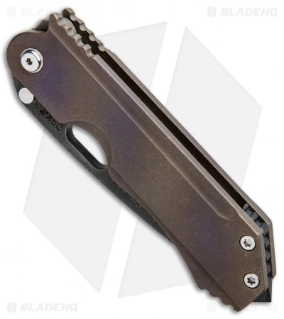The blade on this knife is acid stonewashed. The titanium handle slabs are flamed bronze and purple and it has satin hardware. It features a gray titanium pocket clip and a black backspacer that has a pointed pommel strike.