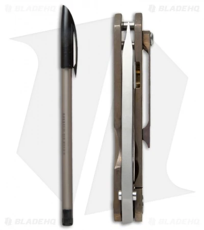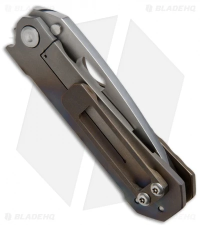 The blade on this knife is two-tone finished; polished primary hollow grind and spine, while the flats are bead blast finished. The front handle slab is gold anodized and the frame lock back slab is heat colored.