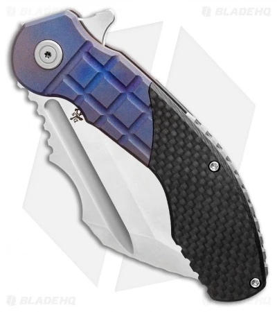 The DSK Tactical VX-P comes in as a production knife from DSK. The VX-P is a full-size tactical folder that opens with the flipper. It has a titanium handle with carbon fiber scales, and a drastic Wharncliffe blade made of CPM-20CV. This model has been overhauled with a blue anodized grid textured titanium handle.