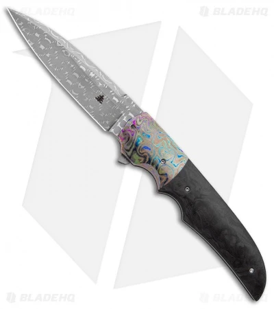 This custom Jason Clark Hybrid DP Flipper has a dagger ground razor wire Damascus blade with just one sharpened edge. Marbled carbon fiber handle with a zirconium bolster and titanium frame lock back. Ball bearing system for smooth and precise action. This Jason Clark folder is an excellent choice for everyday carry and comes with a tip-up carry titanium pocket clip.