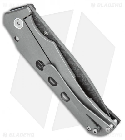 This Jason Guthrie Custom Scout model features a marbled carbon fiber handle with a skeletonized titanium frame and a Chad Nichols “Blackout” damascus drop point blade. Item has satin hardware and a titanium pocket clip.