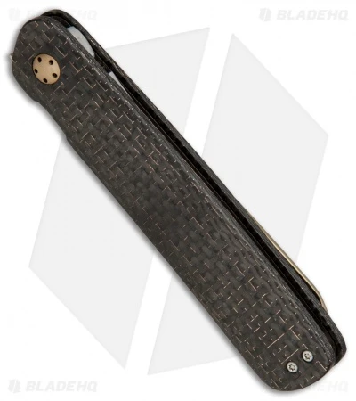 This Pinstripe front flipper knife from JD van Deventer features a Lightning Strike Carbon Fiber handle fitted with a bronzed titanium pivot and pocket clip. Its blade is made from Bohler N690 stainless steel with a fine satin finish and a front flipper opener. The Pinstripe is exceptionally lightweight, and makes a convenient everyday cutting tool.