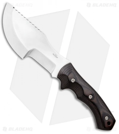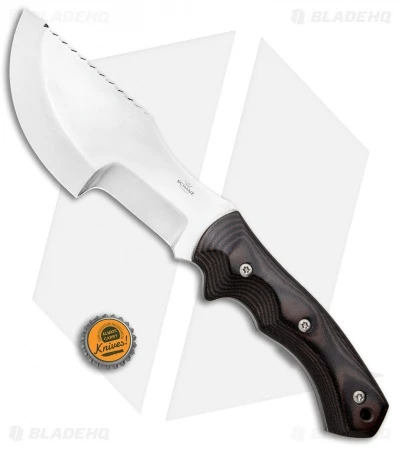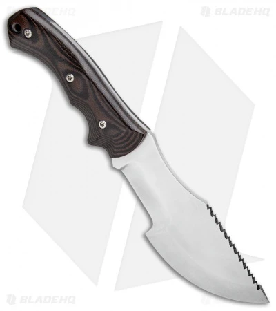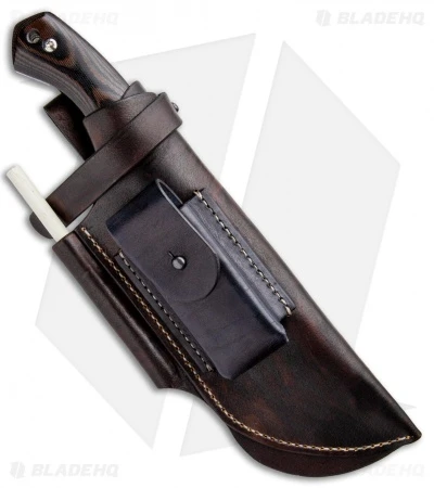 This Wilderness Survival Knife (WSK) from Jurgen Schanz in brown micarta is an extremely well-made fixed blade. The magnificent blade measures just over 2.5″ across at its widest point and utilizes a hollow grind on the draw blade edge and a strong convex grind on the upswept edge. Aggressive saw teeth are present on a portion of the blade spine. Polished, contoured layered Micarta scales over the full-tang blade promote stellar control and comfort. The WSK includes a premium leather sheath.