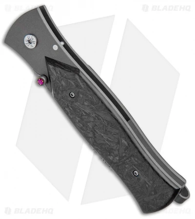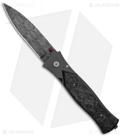 Celebrated knife-maker John Kubasek has created another masterpiece with the custom Gaston folding knife. This model has an impressive damascus blade with a jeweled thumb stud opener. The titanium handle is outfitted with marble carbon fiber scales for a clean and sophisticated look. Item includes a titanium tip up pocket clip and a padded carry pouch.