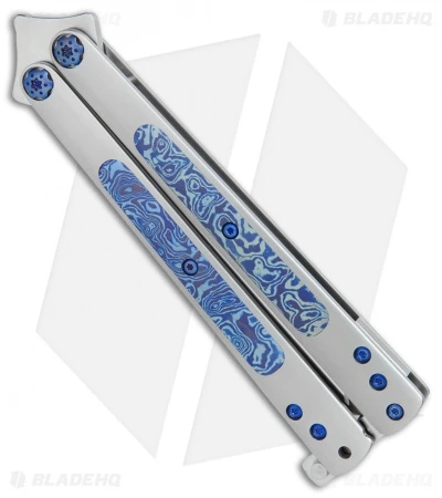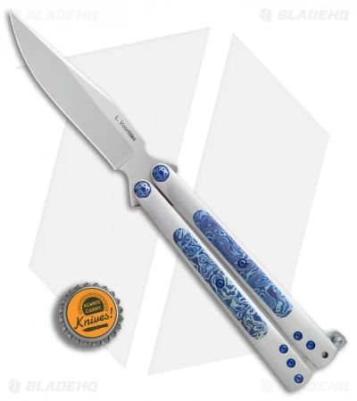 This Les Voorhies Custom butterfly knife is outfitted with a clip point blade and a titanium handle with Timascus inlays and pocket clip.