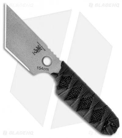 This Tanto Dashi Neck Knife from Sam Eddleman has a stonewash finished 154-CM steel tanto blade with a hollow chisel ground edge and the Eddleman Knives logo up front. The handle has a katana style nylon cord wrap over black rayskin. This knife comes with a Kydex sheath and ball chain for neck carry.