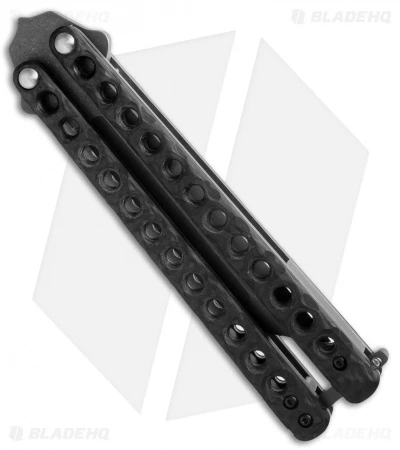 This Sam Eddleman balisong features an acid stonewashed Katana style tanto blade with hollow grinds. It has drilled carbon fiber scales over titanium liners.