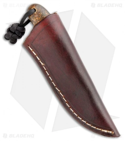 The T.M. Hunt Custom Hedgehog offers a stout, lightweight build that is ideal for daily cutting tasks and outdoor activities. It has a full tang drop point blade made from AEB-L stainless steel with a black acid washed finish. The smooth rounded handle is made from black G-10 and gold “candy stripe” inlays. Item includes a custom leather belt sheath and a black paracord lanyard.