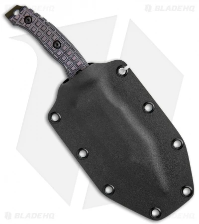 This custom small Bush Bitch fixed blade was designed to tackle surviving in the bush and tactical duties alike. It has a purple textured G-10 handle and a green finished bowie blade. Its ergonomic handle allows multiple grip options to accommodate any task at hand. This model has a hollow ground, full-tang Cru-wear steel blade with a black finish. Item includes a kydex sheath.