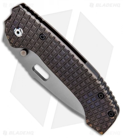 The Trouble Blades Mofo is a heavy-duty folding knife equipped with a wide-bellied clip point blade. This large folder features a full titanium frame lock handle with a bronzed frag pattern design and a black G-10 backspacer. Its thick CPM-4V steel blade comes in a bead blast finish and has a long section of jimping along the spine. Trouble Blades’ Mofo is a rugged, dependable knife that won’t disappoint.