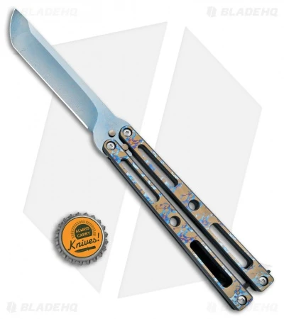 This VMX Butterfly knife sports a Nebula titanium handle and a blued Chad Nichols “Blackout” Damascus tanto blade.